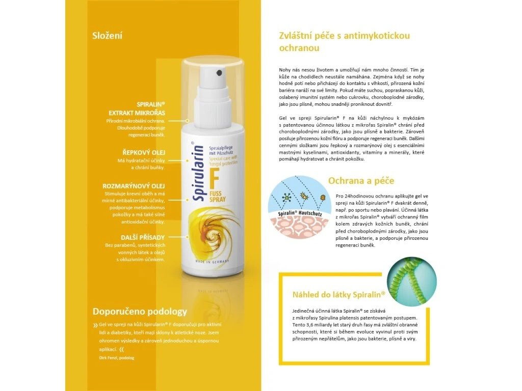 Gel ve spreji Spirularin F na kůži náchylnou k mykózám s patentovanou účinnou látkou z mikrořas chrání před choroboplodnými zárodky, jako jsou plísně a bakterie. Zároveň posiluje přirozenou kožní flóru a podporuje regeneraci buněk. Dalšími cennými složkami jsou řepkový a rozmarýnový olej s esenciálními mastnými kyselinami, antioxidanty, vitamíny a minerály, které pomáhají hydratovat a chránit pokožku.